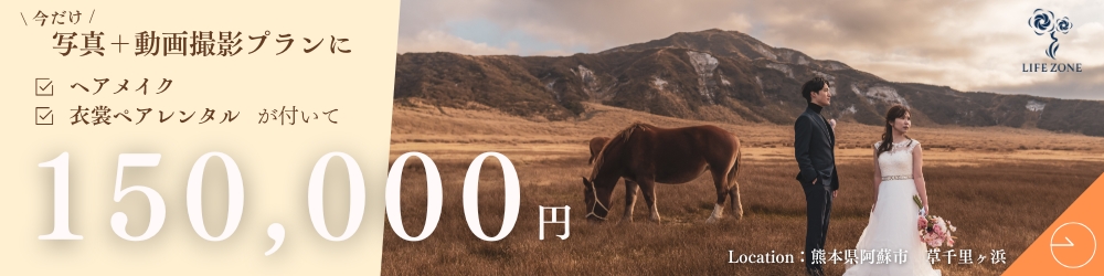 なお、現在LIFE ZONEでは写真+動画撮影にヘアメイク、衣裳レンタル、レンタルブーケが全て付いて150,000円でご提供するキャンペーンを開催中です。